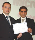 Gonzalo Verdomar Weiss (BBVA Banco Francés) entregó la distinción a Víctor Aimi (izquierda).