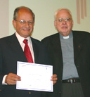 En la foto el doctor Abel Albino muestra el diploma que le entregó el Reverendo Canónigo Carlos Halperín.